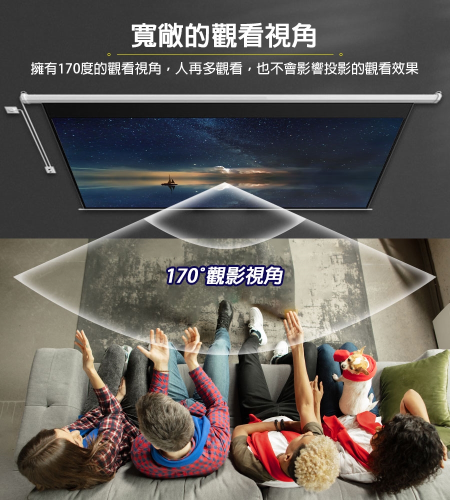 ●請在布幕正中央觀看,中央往外的可視角度為170度,如果超過170度,也就是在布幕之外觀看會比較灰暗喔