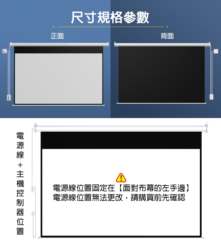 1 / 電動布幕的電源線為【面對電動布幕的左手邊】,無法改右手邊