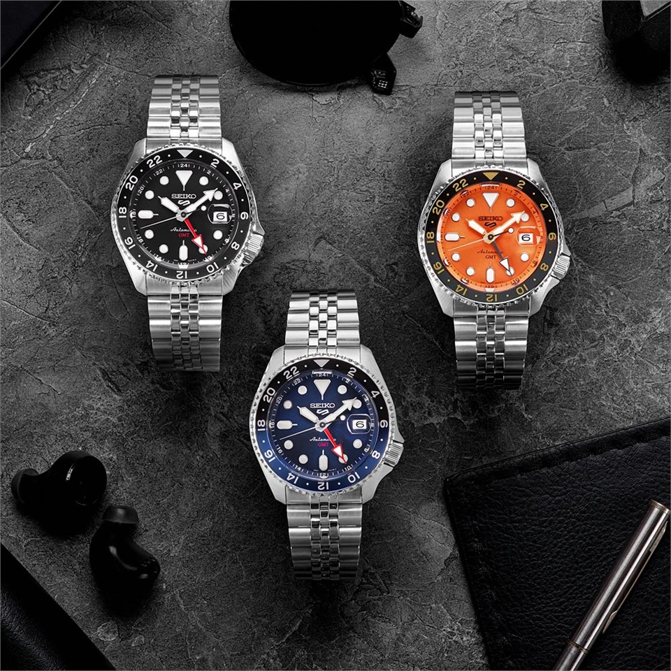 全新 GMT 機芯錶款,三款不同顏色的面盤:黑色、藍色和橙橘色