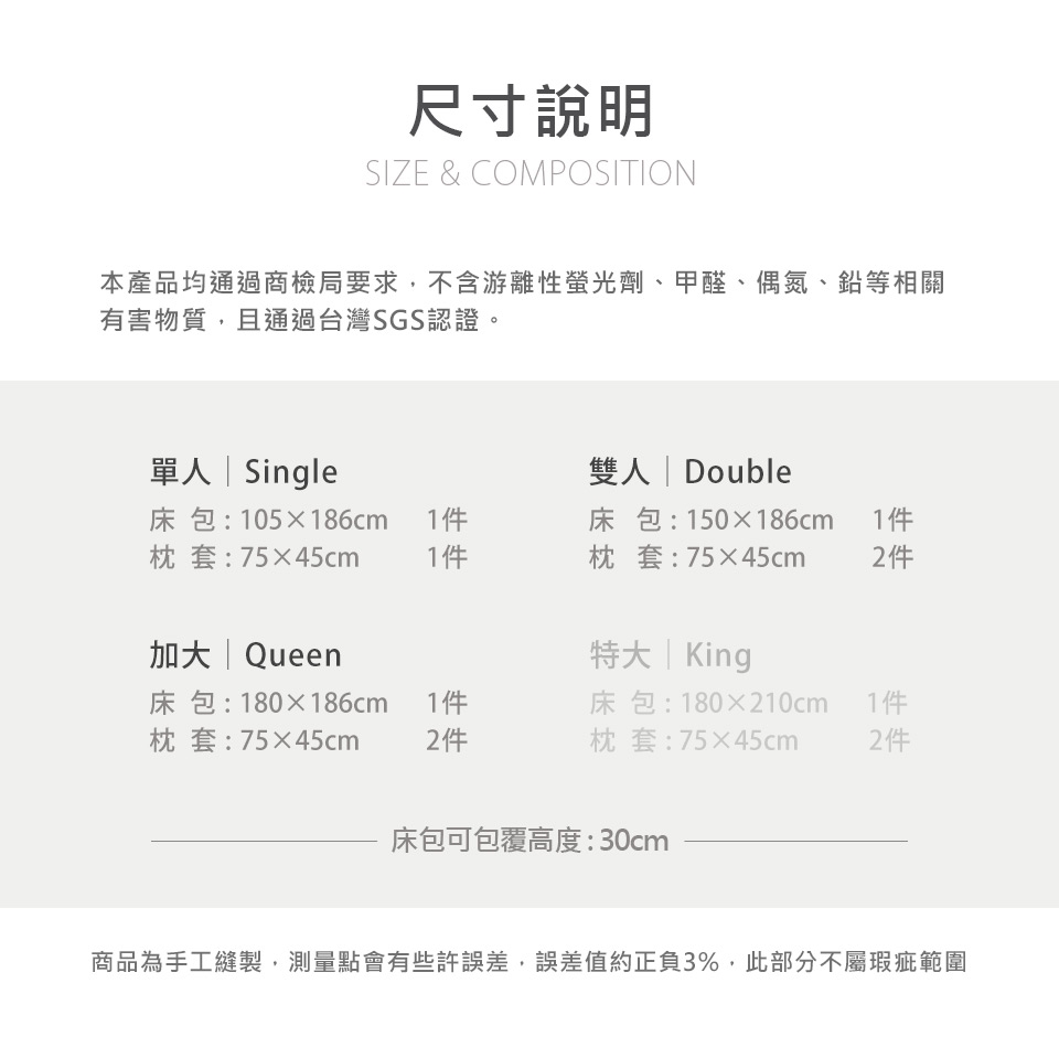 ◆清潔保養方式:可水洗(第一次請用清水)/不可烘乾/不可漂白/勿使用強力漂白清潔劑(含小蘇打、酵素、香氛劑)/浸泡時間請勿超過10分鐘/翻面並放入大型洗衣袋後再以弱機單獨清洗/請勿將洗滌劑直接倒至寢具表面
