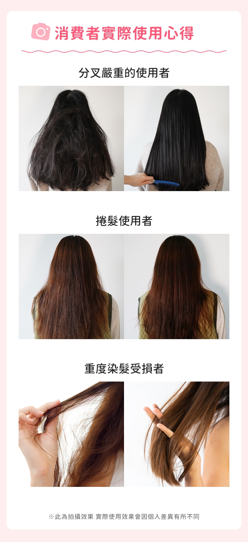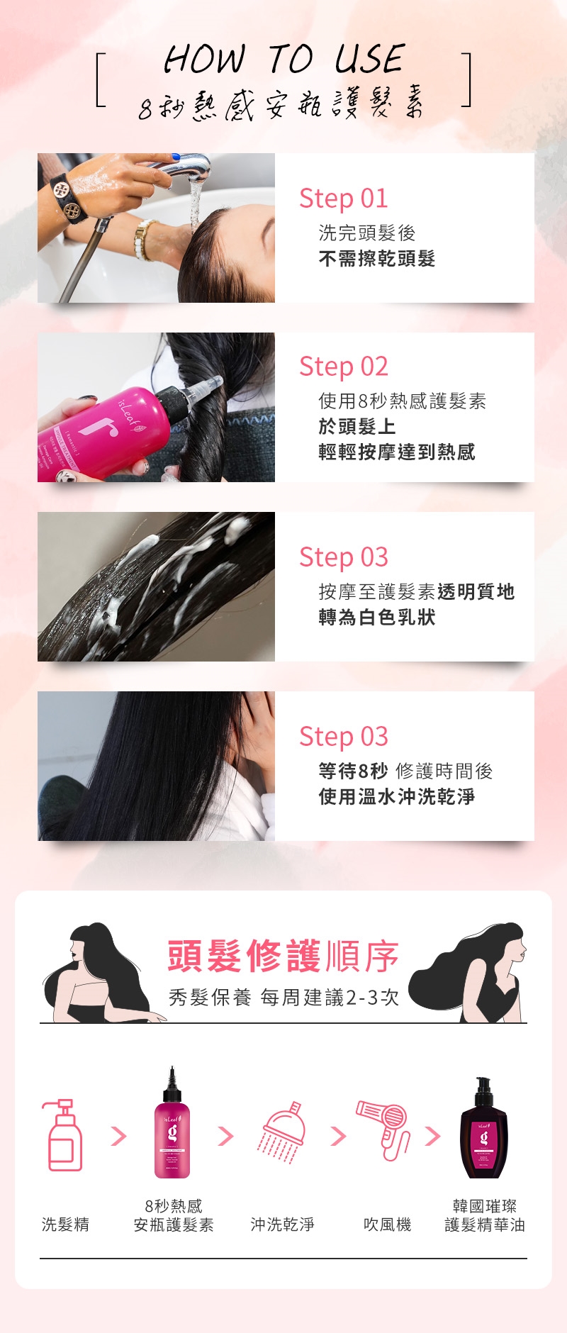 使用方法:洗完頭後用於頭髮按摩達到熱感,透明質地轉為乳白色沖掉 即可達到護髮效果 秀髮好柔順完全不糾結~