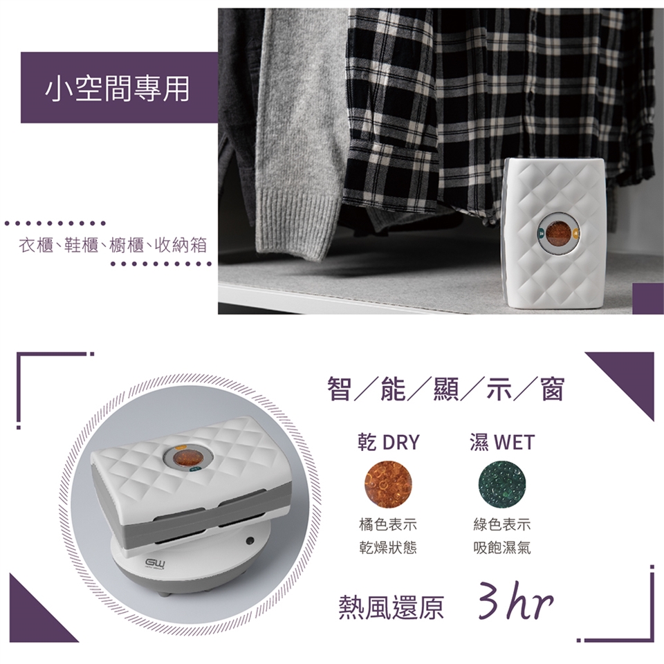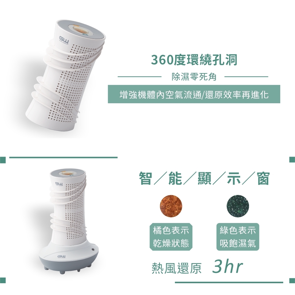 1.GW特殊吸濕顆粒,可吸附微小水分子,為居家生活減少濕氣的傷害,單次最大除濕量達140ml±10 %。