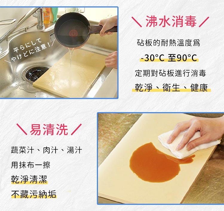 11.高溫消毒溫度建議最好控制在90度以下,並且兩面都需要消毒,避免單面受熱造成砧板彎曲,並注意小心燙傷。
