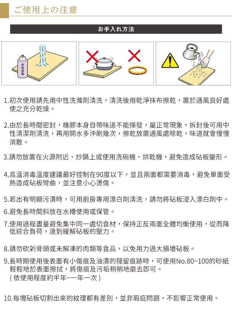 10.請勿放置在火源附近、炒鍋上或使用洗碗機、烘乾機,避免造成砧板變形。