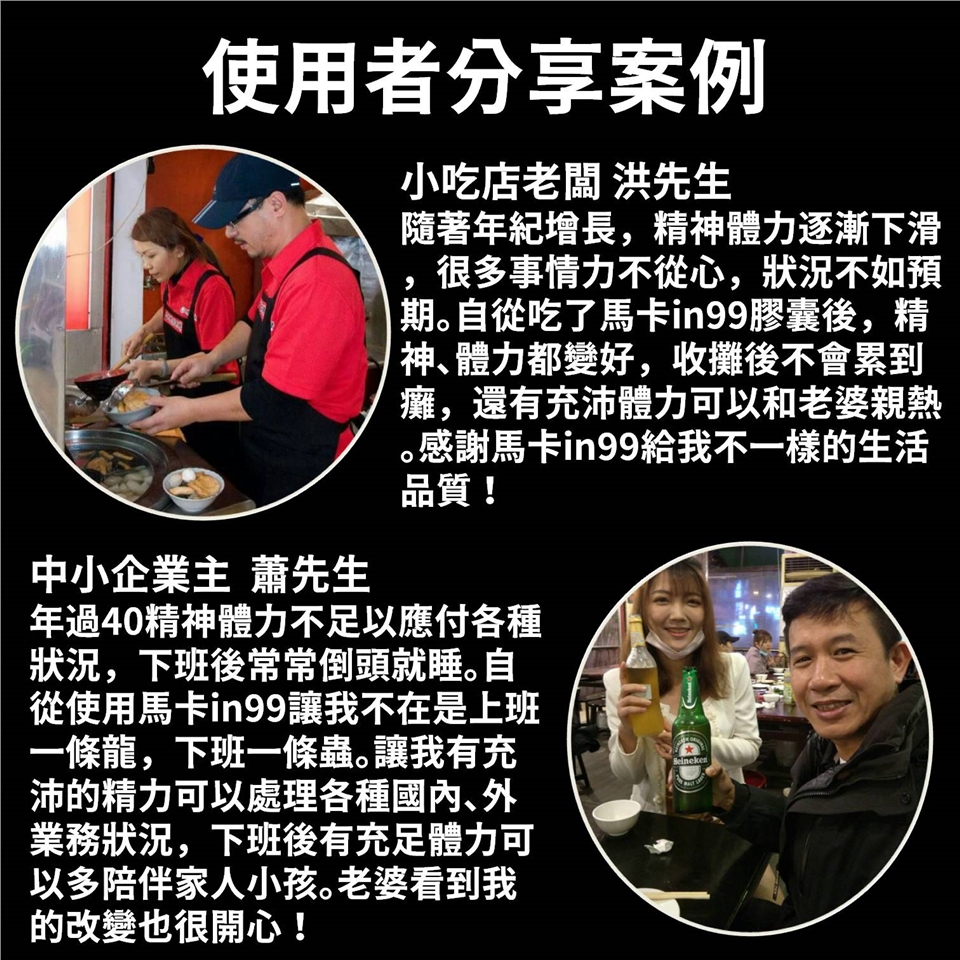 A:瑪卡in99配方,結合東方中醫與西方生物技術,天然萃取高海拔黑瑪卡與高品質草本植萃,長期食用可以滋補強身及增強體力。
