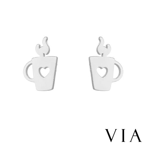 【VIA】時尚系列 冒煙熱可可愛心縷空馬克杯造型白鋼耳釘 造型耳釘 鋼色