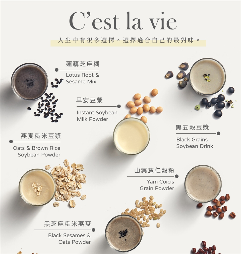 成份: 黃豆(非基因改造)、紫米、麥芽糖、紅豆粉、黑芝麻粉、蓮藕粉。