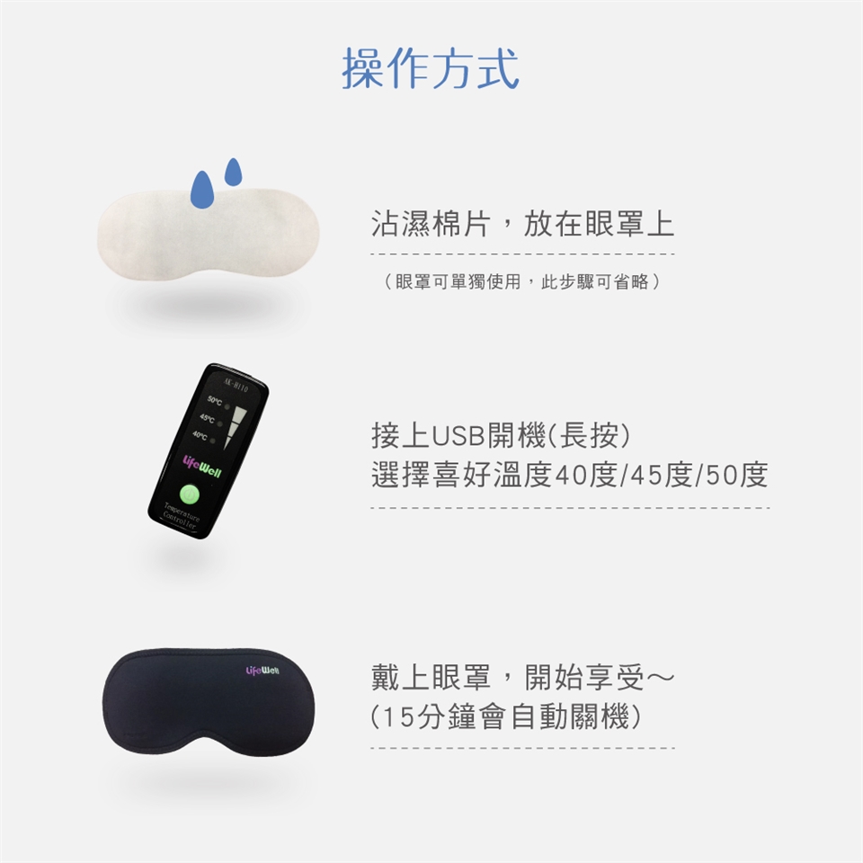 內容物:眼罩*1、溫控器*1、黑色收納盒*1、白色蒸氣布*1包(5入)