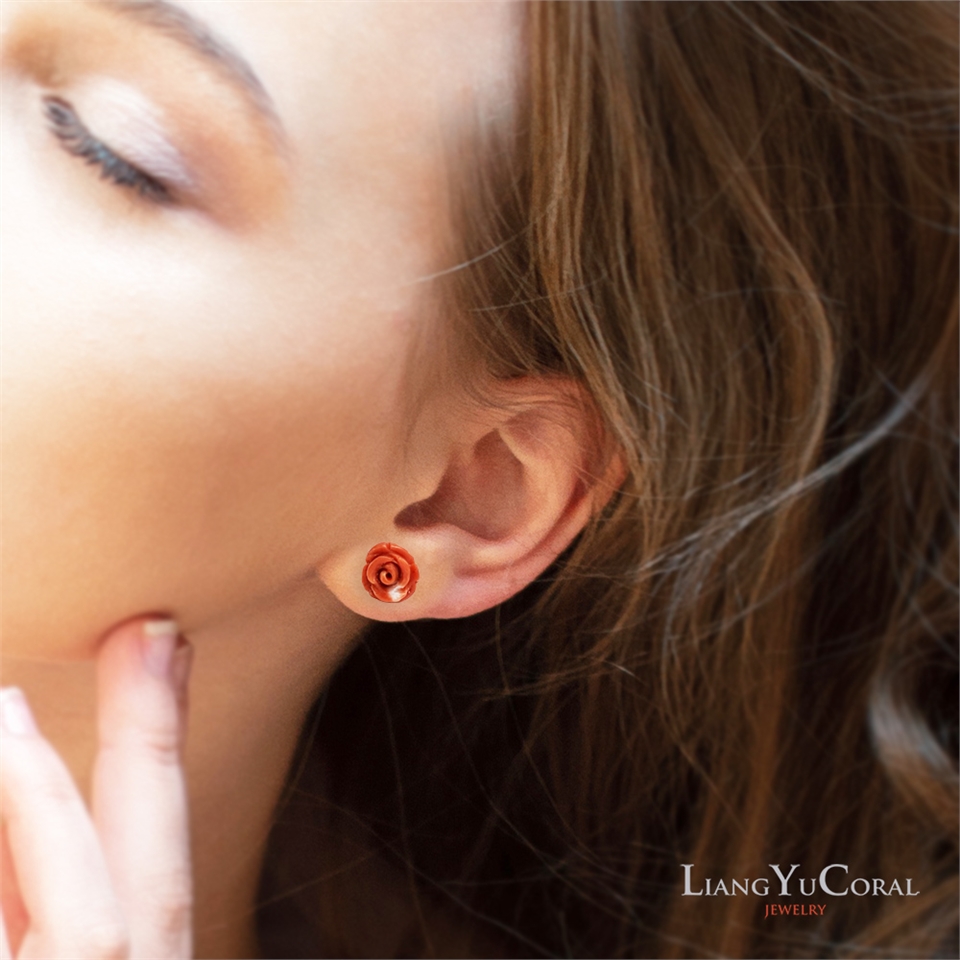 品名:桃紅珊瑚雕刻玫瑰花耳針式耳環