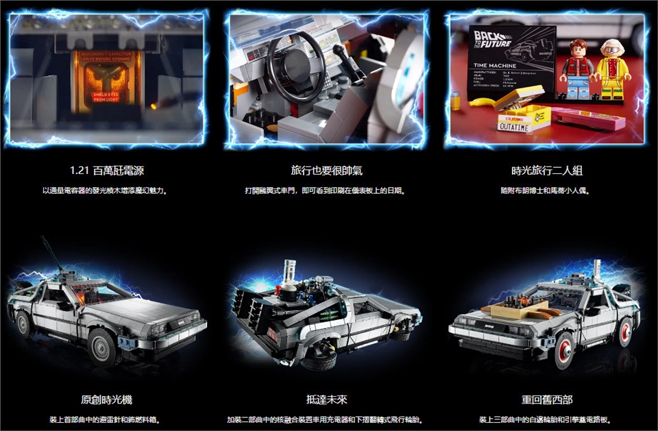 3 種選項任您拼砌-第一版包含避雷針與鈽箱,第二版包含核融合反應器「融解先生」(Mr. Fusion)與懸滯轉換(hover conversion),而第三版則有白邊胎和電路板可開啟的鷗翼式車門-就像在電影中一樣,這款《回到未來》汽車模型搭載可開啟的知名鷗翼式車門