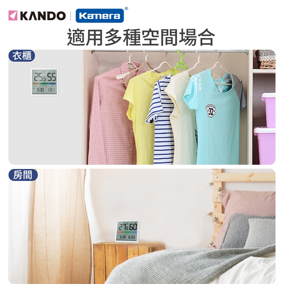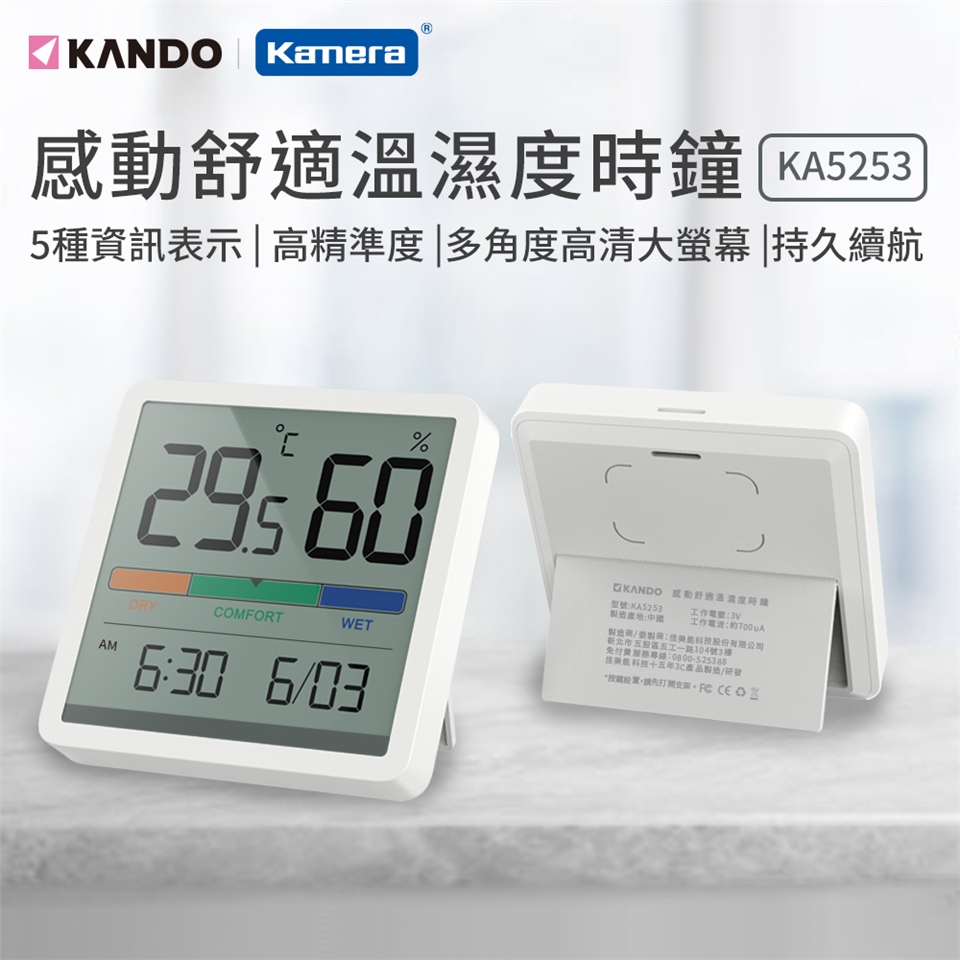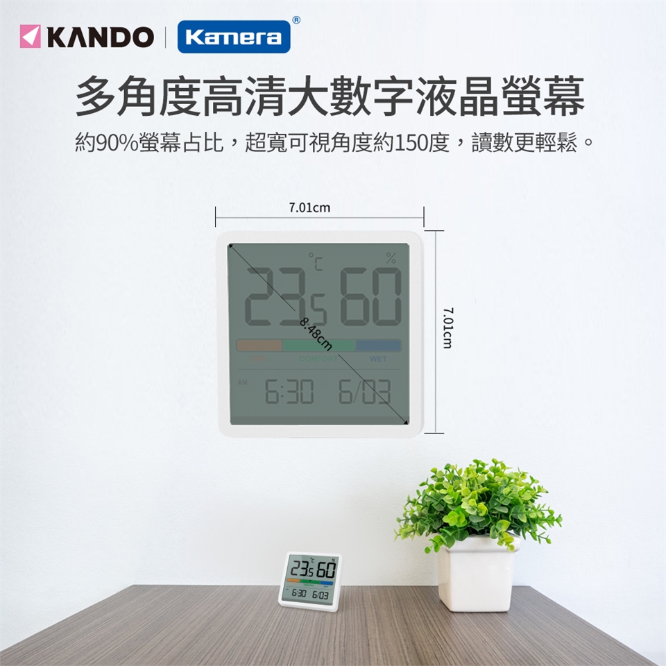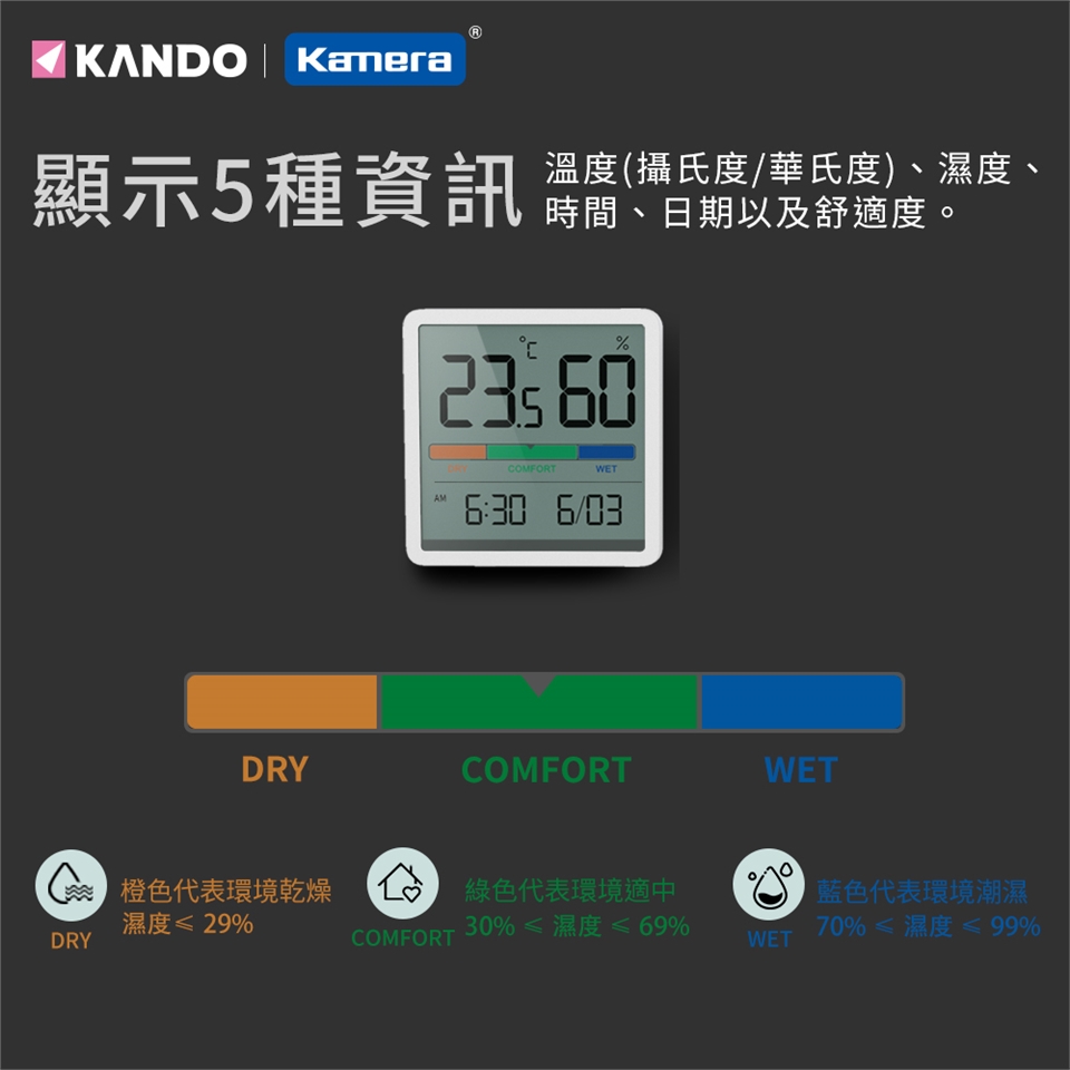 - 顯示5種資訊-溫度(攝氏度/華氏度)、濕度、時間、日期以及舒適度。
