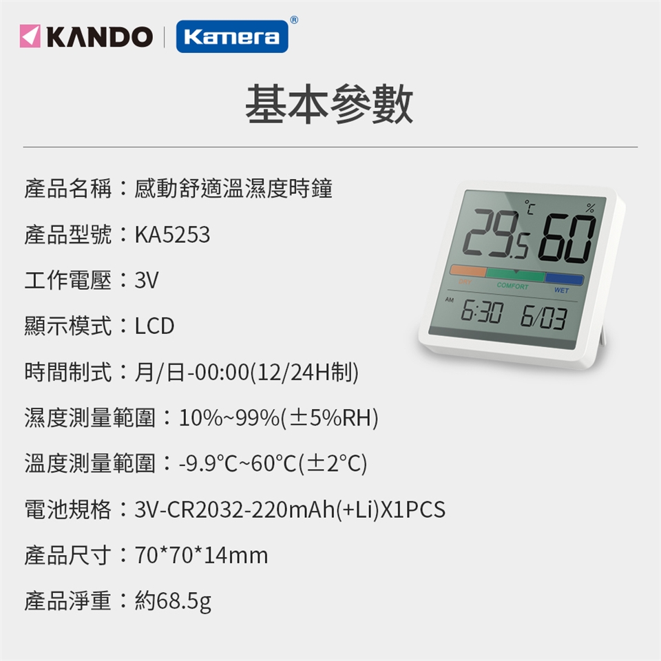 包裝內容:感動舒適溫濕度時鐘*1,說明書*1,(內附CR2032電池*1)