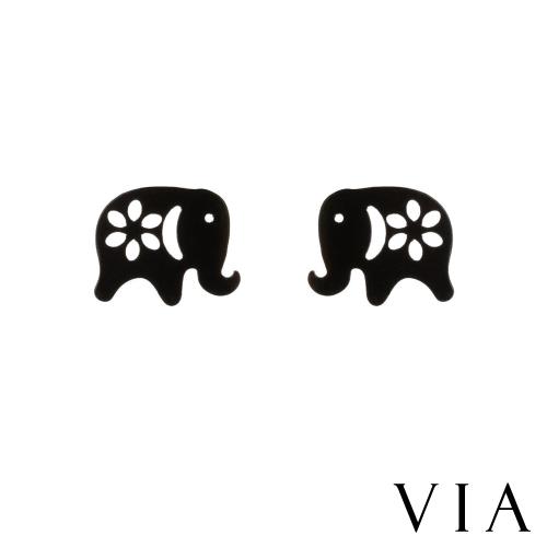 【VIA】動物系列 縷空花朵小象造型白鋼耳釘 造型耳釘 黑色