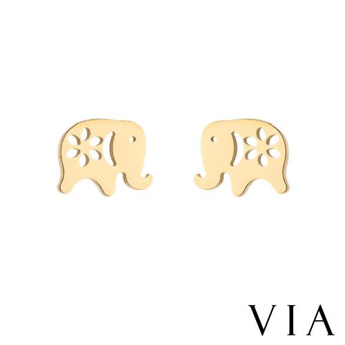 【VIA】動物系列 縷空花朵小象造型白鋼耳釘 造型耳釘 金色