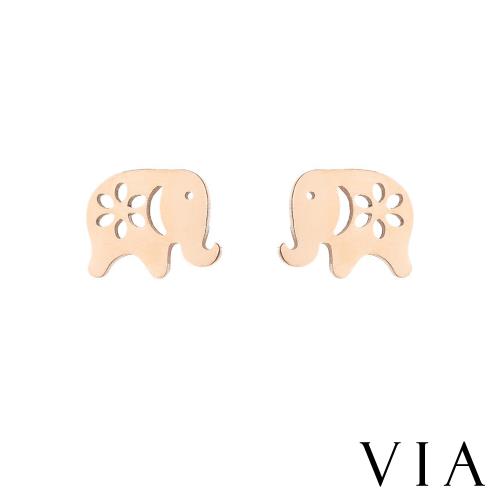 【VIA】動物系列 縷空花朵小象造型白鋼耳釘 造型耳釘 玫瑰金色