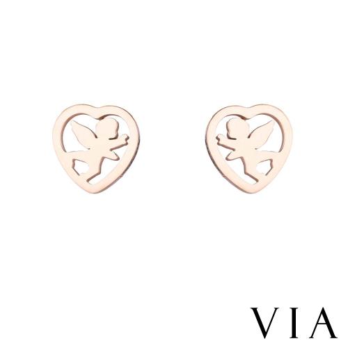 【VIA】時尚系列 愛心縷空線條邱比特造型白鋼耳釘 造型耳釘玫瑰金色