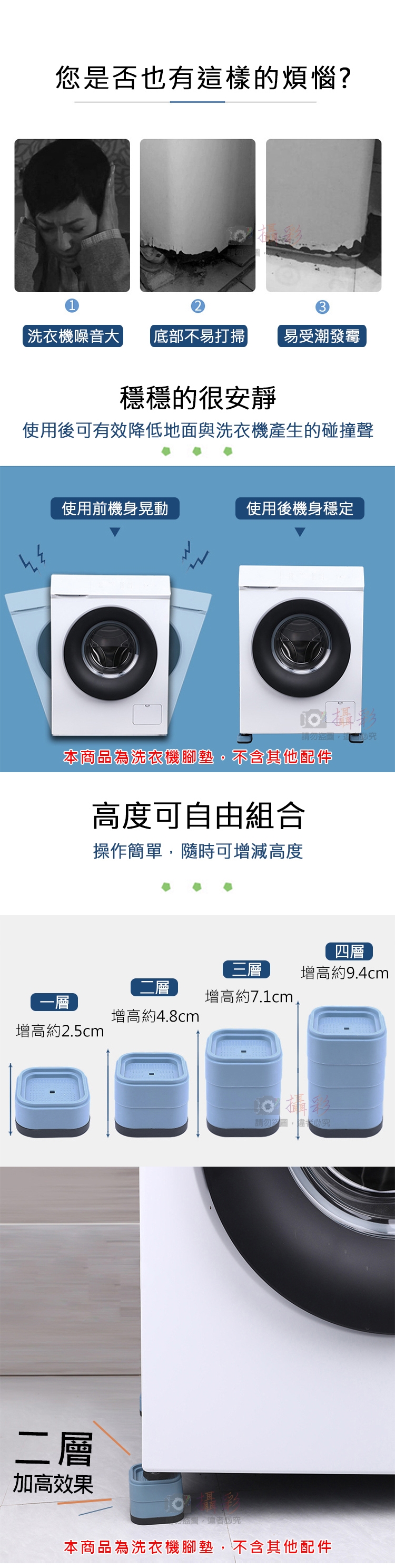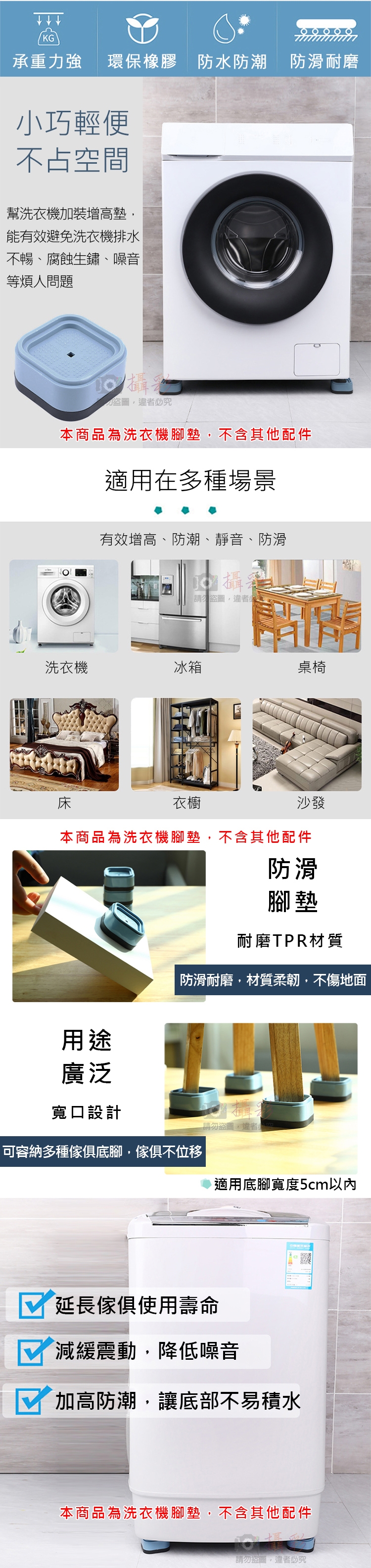 功 能:預防洗衣機、桌子、椅子等傢俱腳底磨擦地面發出噪音,還可以加高底部達到防潮、防霉、好清理
