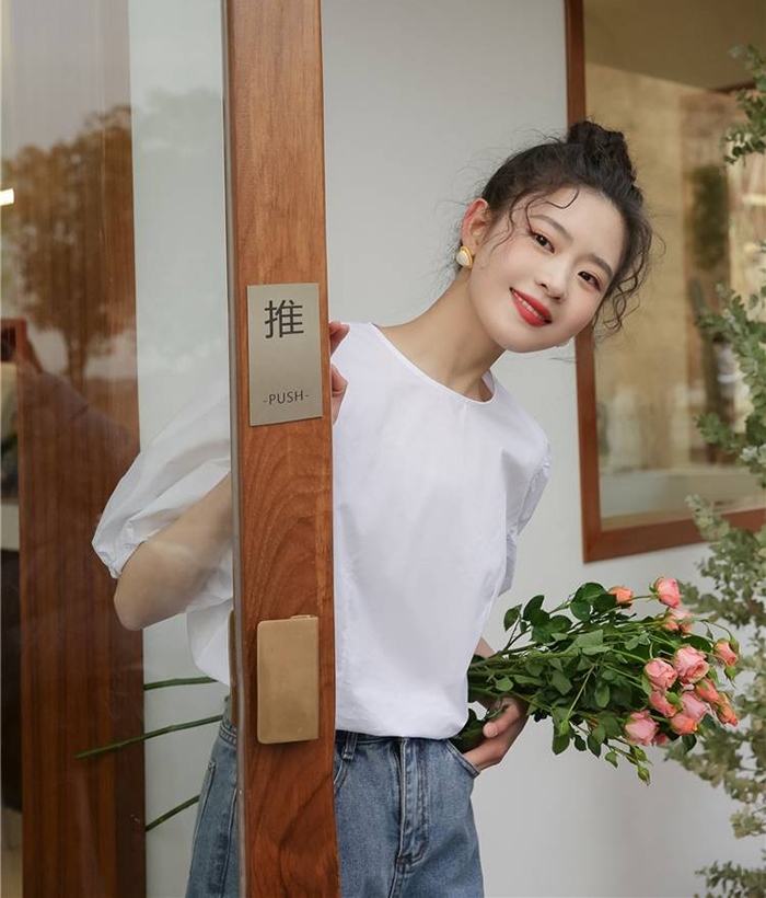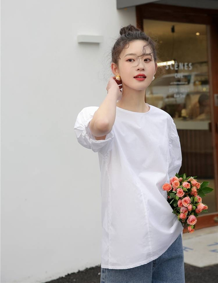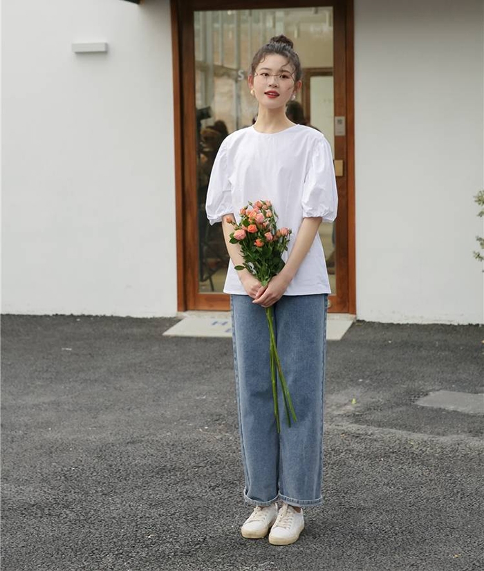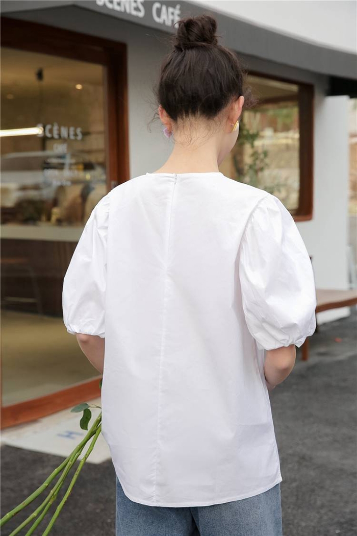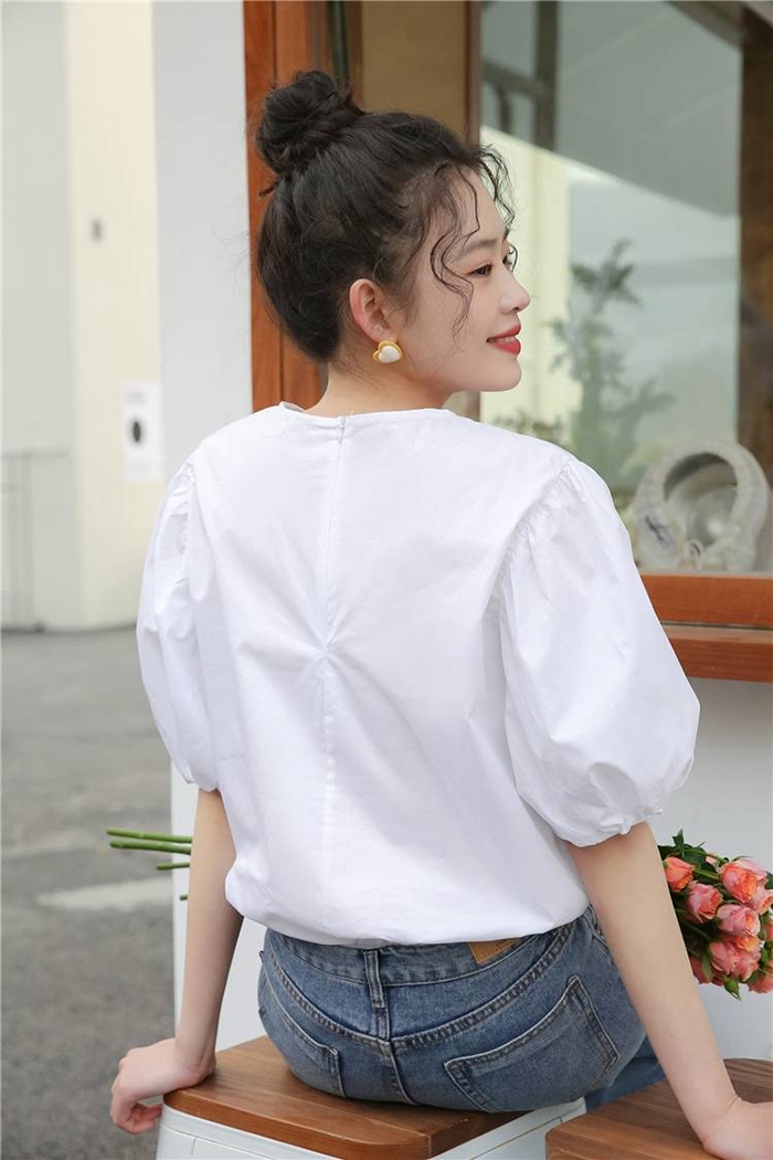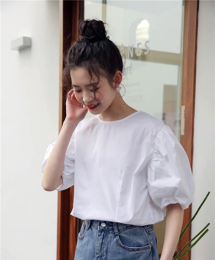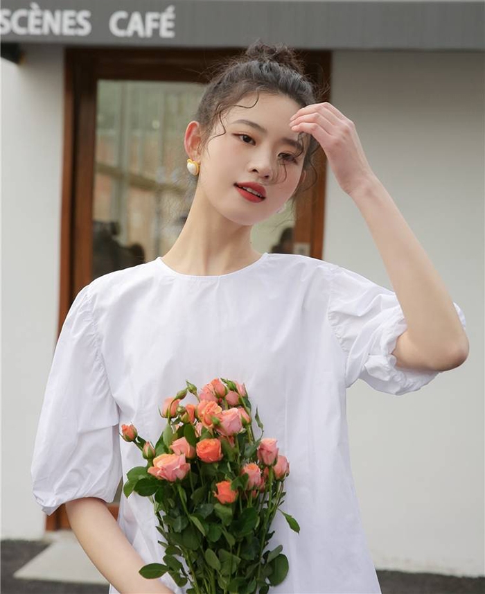 簡約純色調搭配浪漫的泡泡袖,