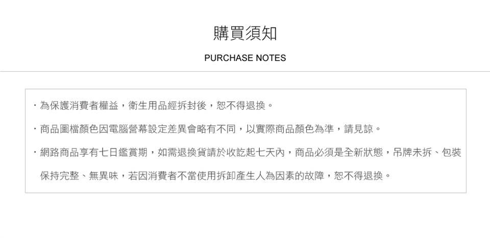 ► 基於衛生健康問題與維護顧客權益,貼身內褲、口罩、眼罩、襪子以及所有寢具商品,在您還不確定是否要辦理退貨前,請勿拆標與使用。