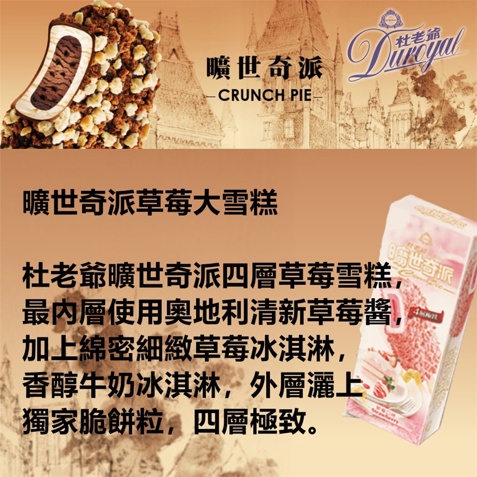 加上綿密細緻草莓冰淇淋,香醇牛奶冰淇淋,外層灑上獨家脆餅粒,四層極致。