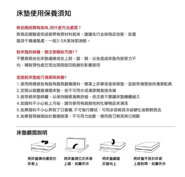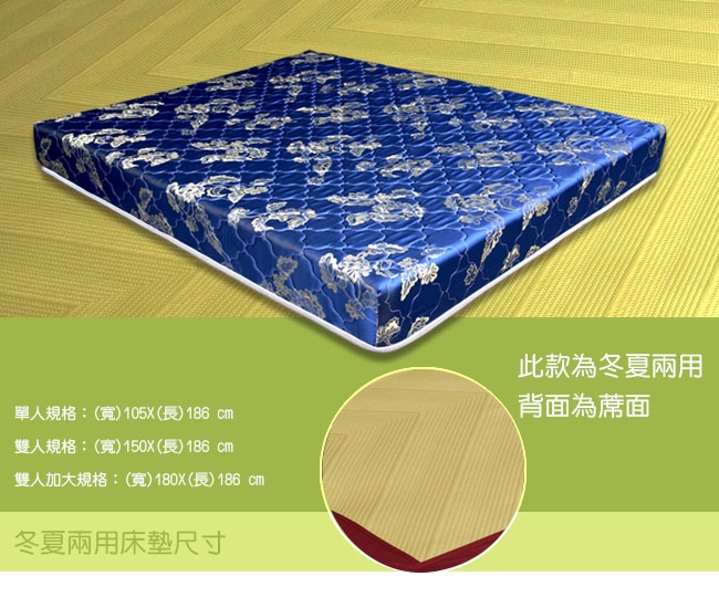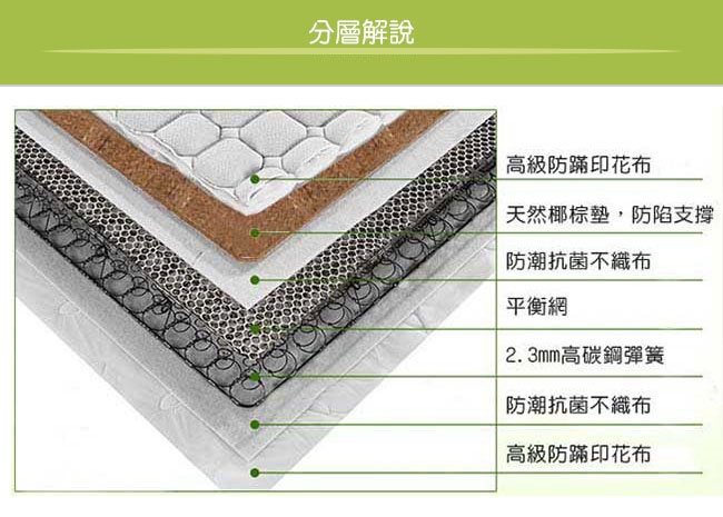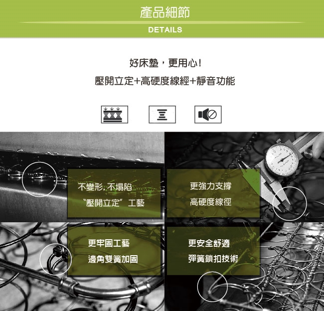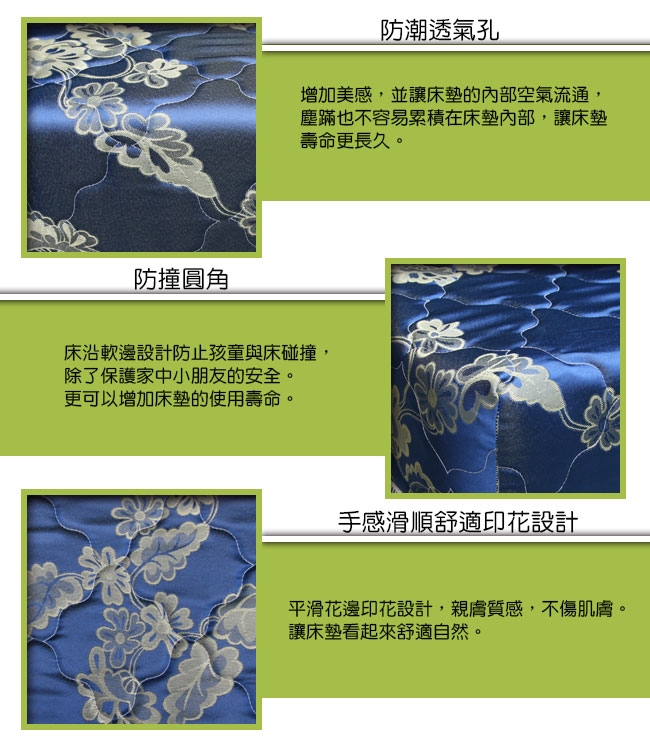 鴨鴨居家有著高級床墊才有的舒柔觸感,是台灣最佳的睡眠選擇;表層織布和舒適冬夏兩用設計外,經由台灣師傅細心的精緻製作,使用更多舒眠層材料及更好的材質,打造出專有的柔順感。高硬度支撐彈簧,中鋼高碳鋼彈簧體經高溫回火處理,比一般未經處理的彈簧韌性更強,具有高回彈性及不易變型的優點,兼具穩定性及平衡感,讓使用者睡的更安穩。融合舒服觸感使得透氣性更佳,精緻材質,真材實料,健康、舒適、好眠三種極致享受一次到位。
