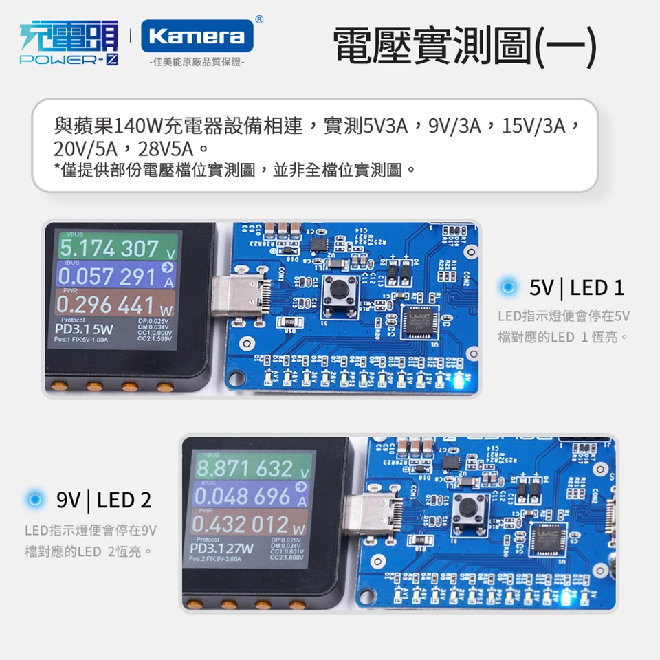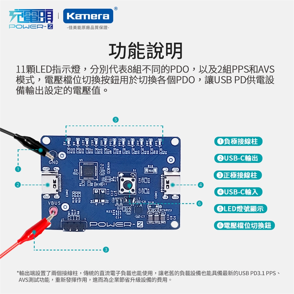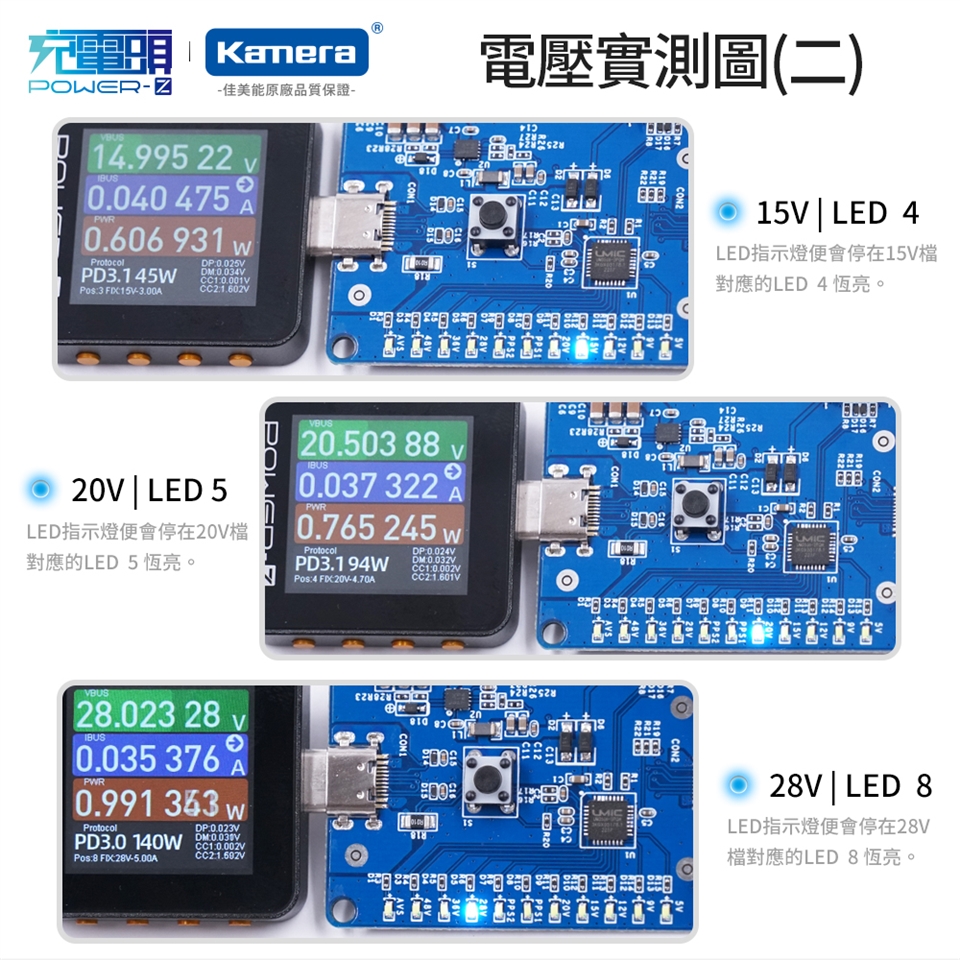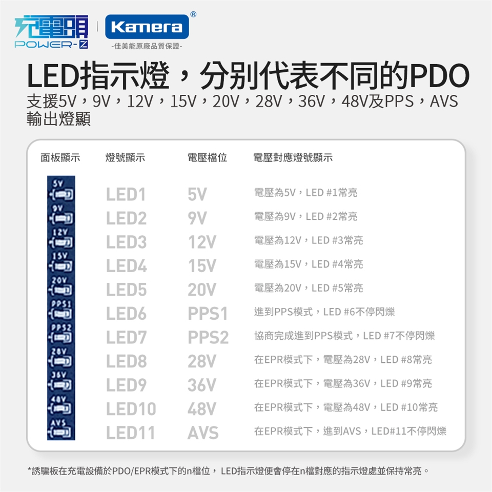 - 支援5V,9V,12V,15V,20V,28V,36V,48V及PPS,AVS輸出燈顯