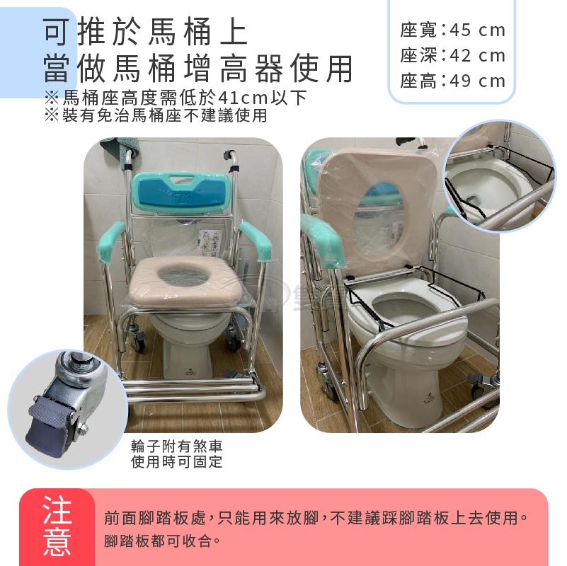 請注意、如果要推進去廁所使用、請先測量廁所門的寬度、並參考商品尺寸總寬、以免購買後推不進去廁所、謝謝