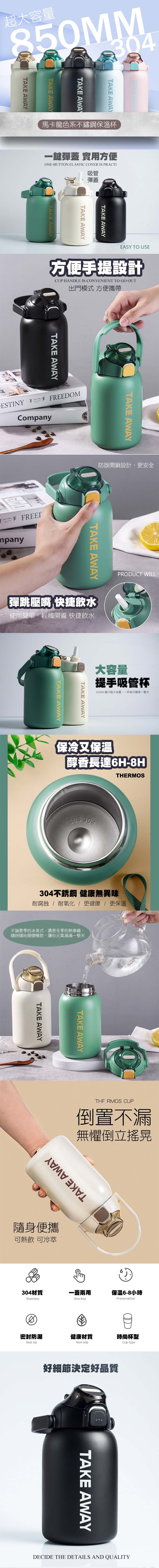 高顏值大容量保溫杯,6~8小時長效保溫, 夏天保冷,冬天保熱,一年四季都能用,不論是夏季的冰美式,還是冬季的熱拿鐵,隨時隨地開懷暢飲,讓你元氣滿滿一整天,850毫升超大容量,一杯就可享受一整天,304不鏽鋼材質,健康無異味,耐腐蝕、耐氧化、更保溫,可樂、奶茶、咖啡、茶水都能裝!
