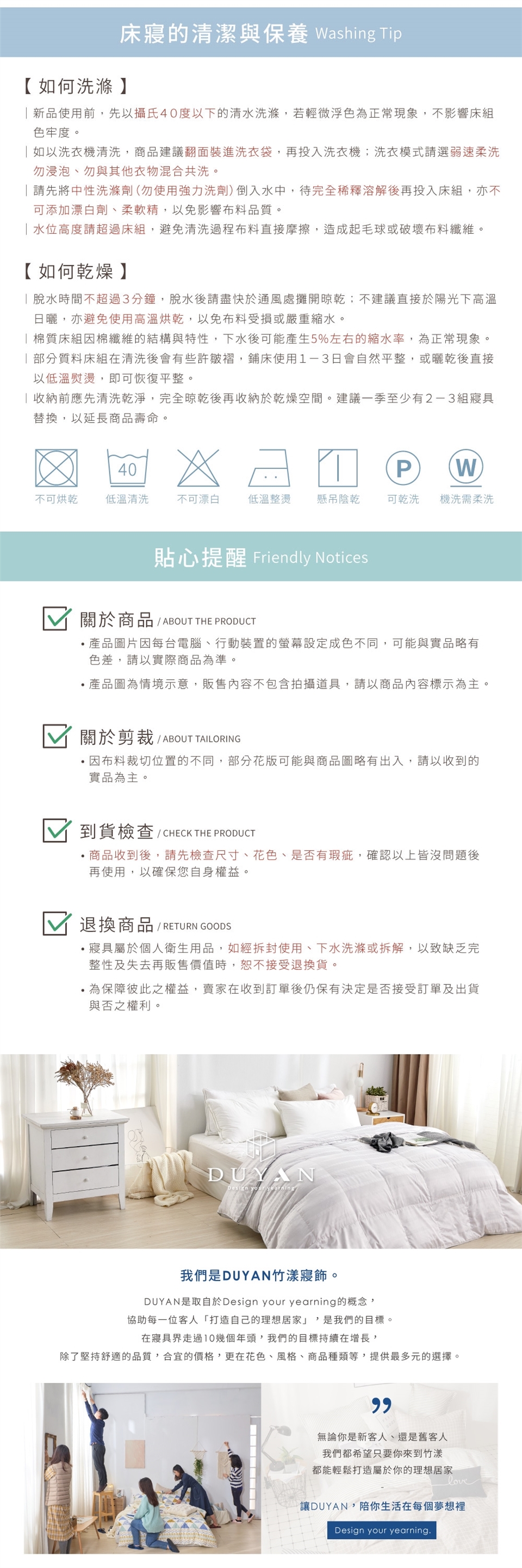 不可漂白、乾洗,並定期日曬達到消毒除溼效果