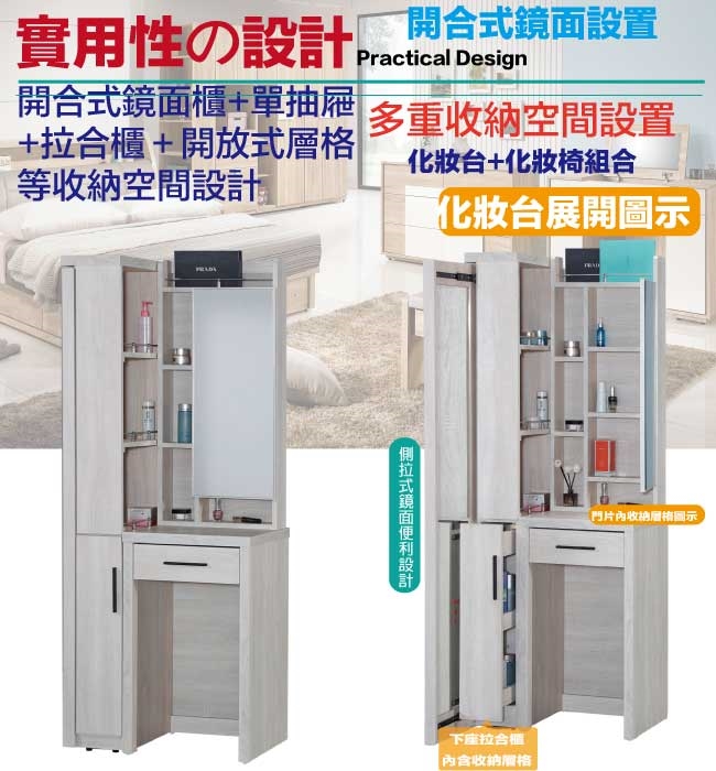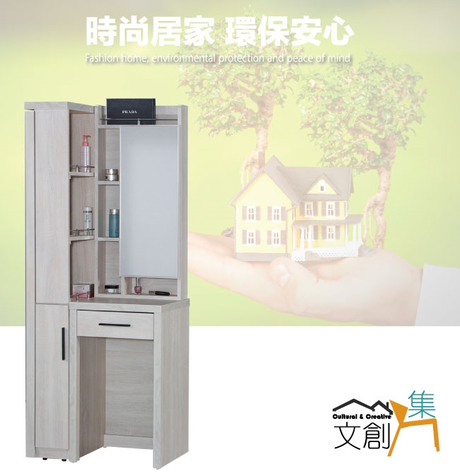 【文創集】派斯2.2尺開合式鏡台/化妝台組合(鏡台+側拉鏡面櫃+不含化妝椅) 淺橡木紋色系+現代簡約風格+安心材質製造,整體採用防蛀木心板+防潮耐磨腳座+五金滑軌結構+強化玻璃鏡面等安心材質製造,產品外層採用防潮耐磨噴漆處理搭配採用開合式鏡面櫃+側拉式鏡面+開門櫃+單抽屜+開放式層格等收納空間設計,全由專人配送到家,專業安心服務,替你省下更多時間!