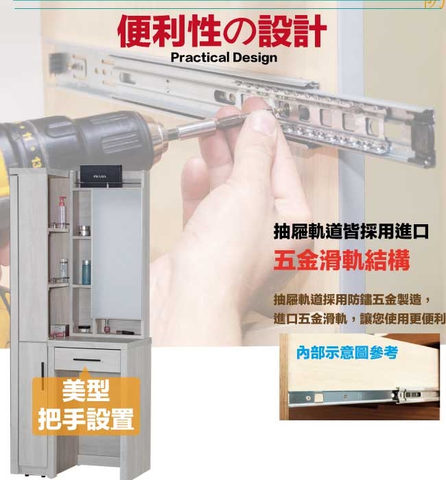 採用防蛀木心板+防潮耐磨腳座+五金滑軌結構+強化玻璃鏡面等安心材質製造