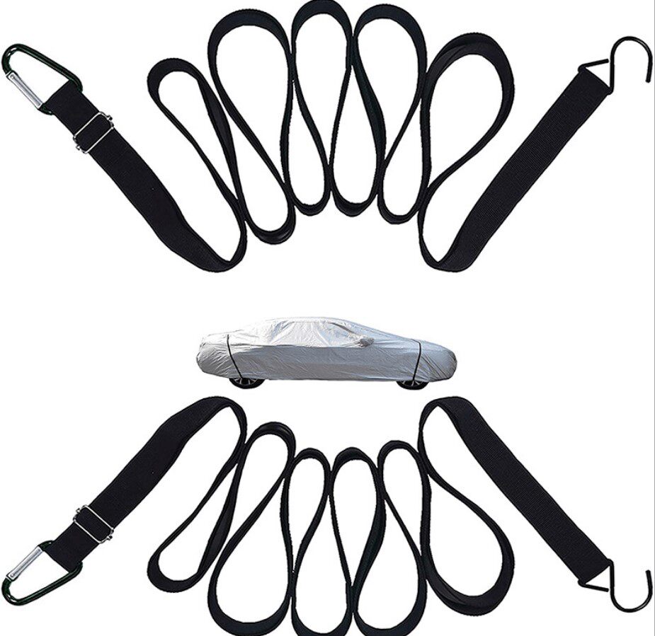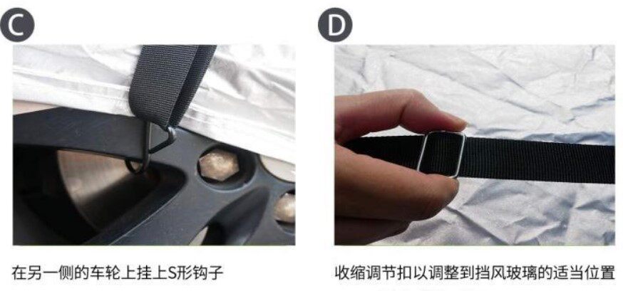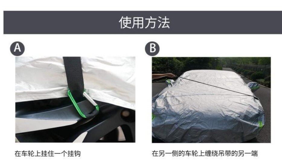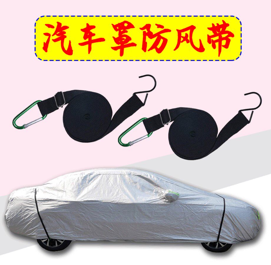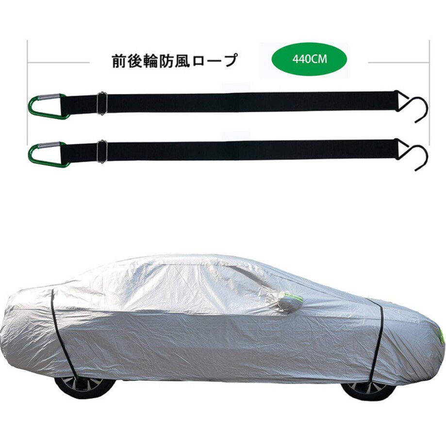 [強風對策]:前后防風條,用厚厚的繩子,兩端是鉤子。中間裝備有2個調整的金屬扣。也可以在使用時直接在車輪的車軸上掛鉤或打結。方便快捷節約時間和勞力。購買汽車罩的顧客,強烈建議同時購買這個產品。給車提供護塵的體驗。在大風天或臺風來襲時,為了防止車罩被風刮跑,要戴上它來抵抗強風,保護愛車。