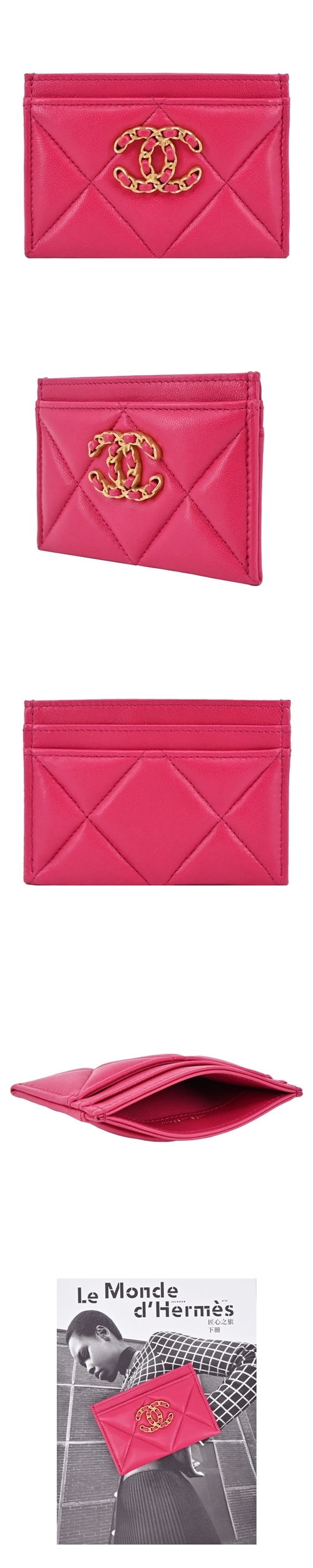 CHANEL 經典雙C LOGO菱格紋小羊皮卡片夾(桃紅)