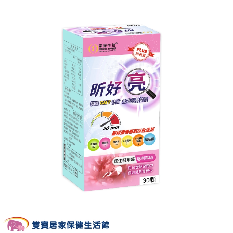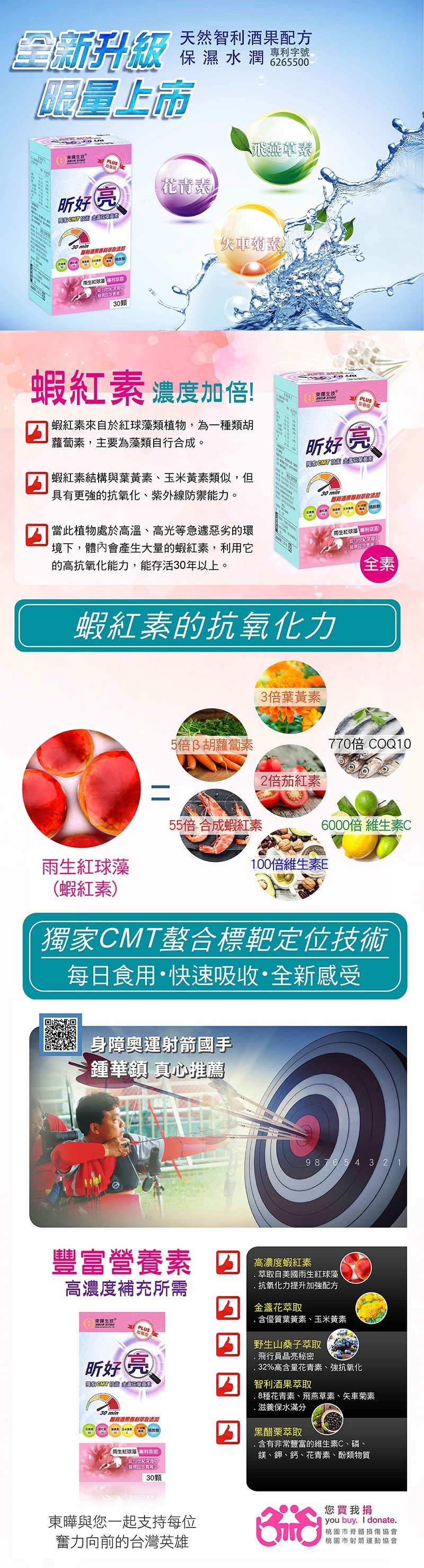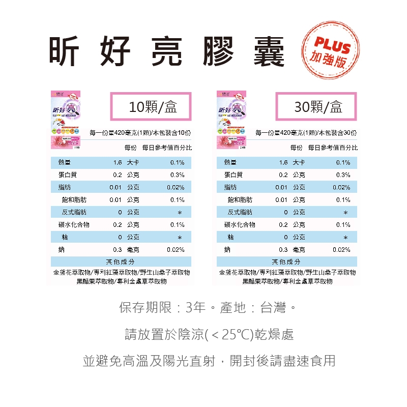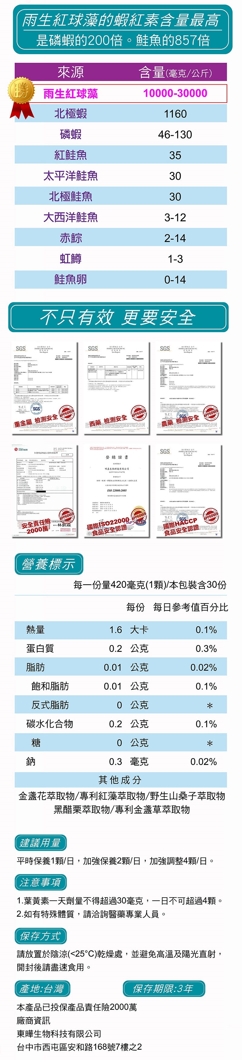 L-精胺酸、藍莓粉、金盞草萃取物(含脂化型葉黃素)(金盞草萃取、維結晶狀α-纖維素、二氧化矽、維生素E(抗氧化劑)、維生素C(抗氧化劑))、野生山桑子萃取物(含花青素)(山桑子萃取、麥芽糊精)、黑醋栗萃取物、ˋ專利紅棗萃取物(含蝦紅素)(海藻酸鈉、豌豆蛋白、紅棗萃取)、專利智利酒果萃取物(智利酒果、麥芽糊精)、鋅酵母、β-胡蘿蔔素(辛烯基丁二酸鈉澱粉、醣、β-胡蘿蔔素、水、維生素C(抗氧化劑)、維生素E(抗氧化劑))、專利金盞草抽取物(含游離型葉黃素)(辛烯基丁二酸鈉澱粉、葡萄糖粉、蔗糖、葉黃素(金盞草萃取物)、維生素C(抗氧化劑)),專利金盞草抽取物(含游離型玉米黃素)(蔗糖、辛烯基丁二酸鈉澱粉、金盞草抽出物)、維結晶狀α-纖維素、二氧化矽