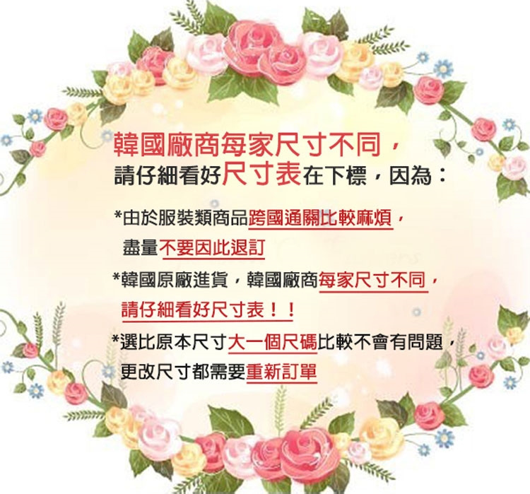 1.請消費者收到商品後先行試穿,符合尺寸後才將吊牌剪下,如有下水或污損和商品短缺香水味,恕不退貨