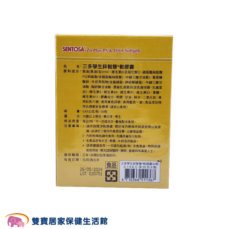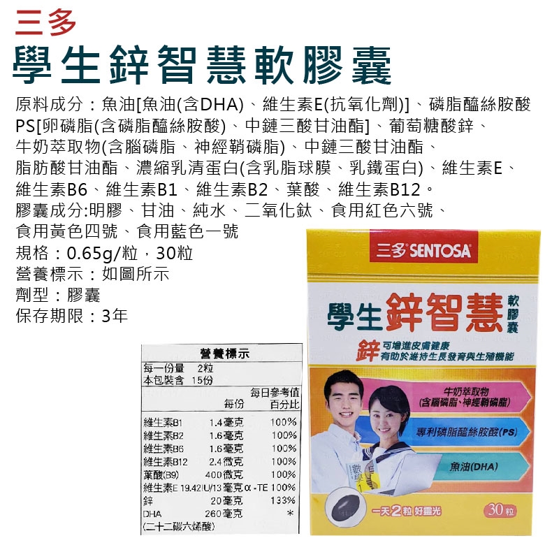 原料成分:魚油[魚油(含DHA)、維生素E(抗氧化劑)]、磷脂醯絲胺酸PS[卵磷脂(含磷脂醯絲胺酸)、中鏈三酸甘油酯]、葡萄糖酸鋅、牛奶萃取物(含腦磷脂、神經鞘磷脂)、中鏈三酸甘油酯、脂肪酸甘油酯、濃縮乳清蛋白(含乳脂球膜、乳鐵蛋白)、維生素E、維生素B6、維生素B1、維生素B2、葉酸、維生素B12。膠囊成分:明膠、甘油、純水、二氧化鈦、食用紅色六號、食用黃色四號、食用藍色一號