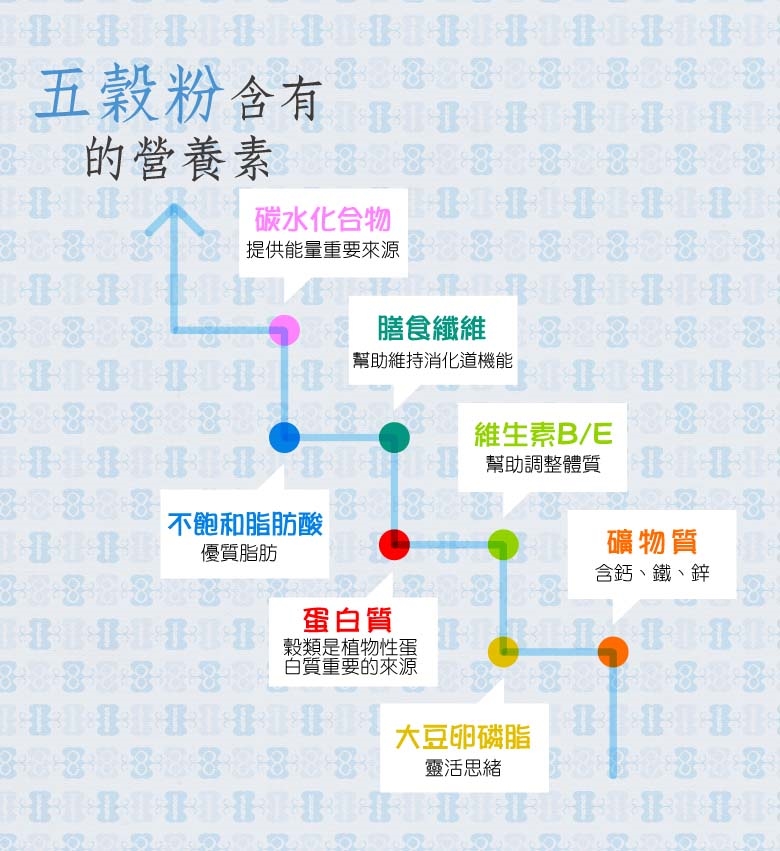 成分:五穀雜糧(非基改黃豆、薏仁、燕麥、蕎麥、糯米、糙米、紅小麥、非基改玉米、小米、紅豆、綠豆、米豆、青豌豆、黑豆、花豆、大麥仁 )、麥芽粉(大麥、麥芽)、大豆卵磷脂、綜合草(木)本植物(淮山(山藥)、芡實、百合、蓮子、茯苓、白果)、綠茶抽出物