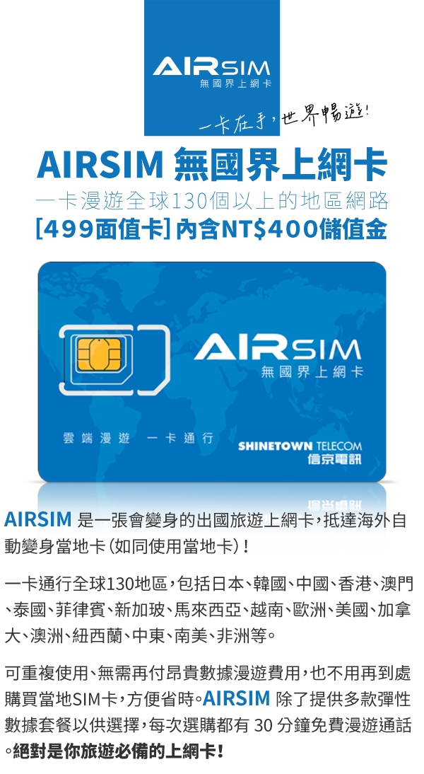 包裝內容物:AIRSIM 無國界上網卡-499面值卡(含儲值金NT$400)*1、卡套*1、取卡針*1