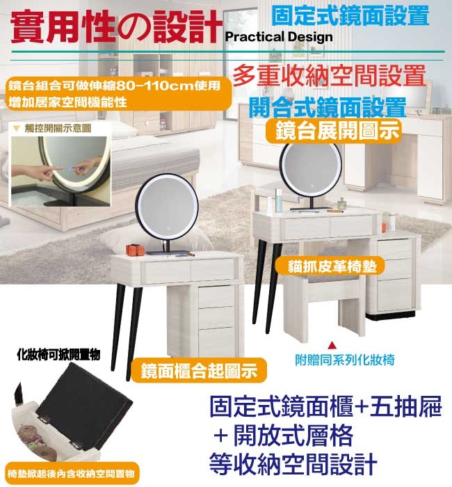 採用固定式鏡面(觸控開關)+五抽屜+開放式層格+可伸縮80-110cm靈活調整等收納空間設計