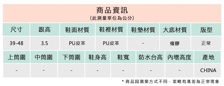 2.鞋類商品依功能及用途之不同,鞋底各有其止滑係數之個別不同,使用鞋類商品請用於正常平坦之路面,非雨鞋或雨靴類商品,請避免穿著於下雨濕滑路面上行走。