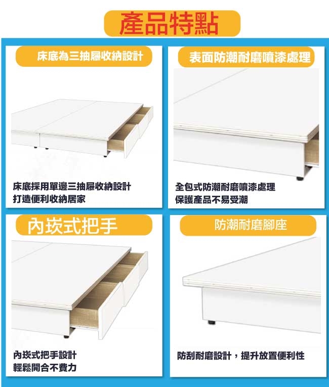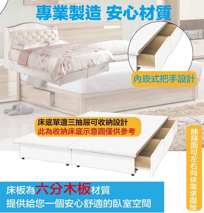 搭配採用床頭箱可掀式床枕板+內外開放層格+床底單邊開合三抽屜等收納空間設計