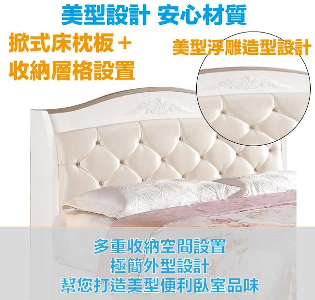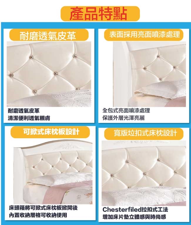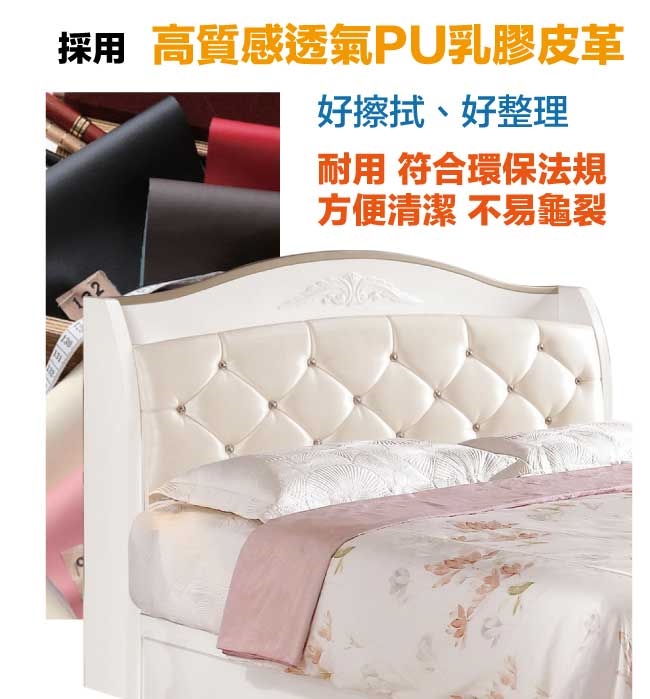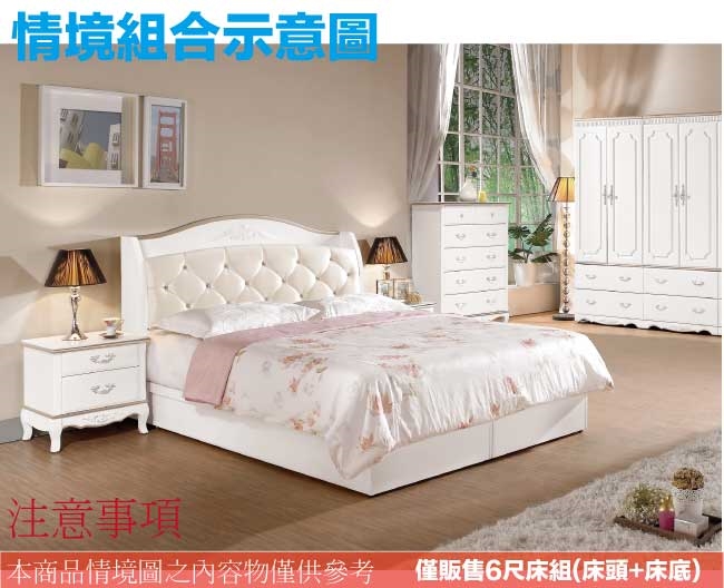 【文創集】帝伊新古典白6尺皮革雙人加大三抽床台組合(床頭箱+三抽床底+不含床墊)   新古典白色系+現代簡約風格+安心材質製造,整體採用松木實木+防蛀木心板+防潮MDF板材+六分木床板+防潮耐磨腳座+透氣乳膠皮革+高密度泡棉等安心材質製造,產品外層採用防潮亮面噴漆處理搭配採用床頭箱可掀式床枕板+內外開放層格+床底單邊開合三抽屜等收納空間設計,全由專人配送到家,專業安心服務,替你省下更多時間!