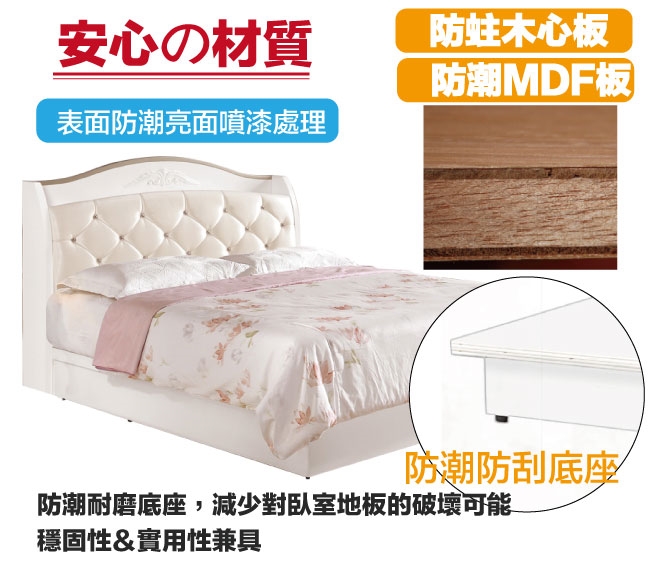 採用松木實木+防蛀木心板+防潮MDF板材+六分木床板+防潮耐磨腳座+透氣乳膠皮革+高密度泡棉等安心材質製造