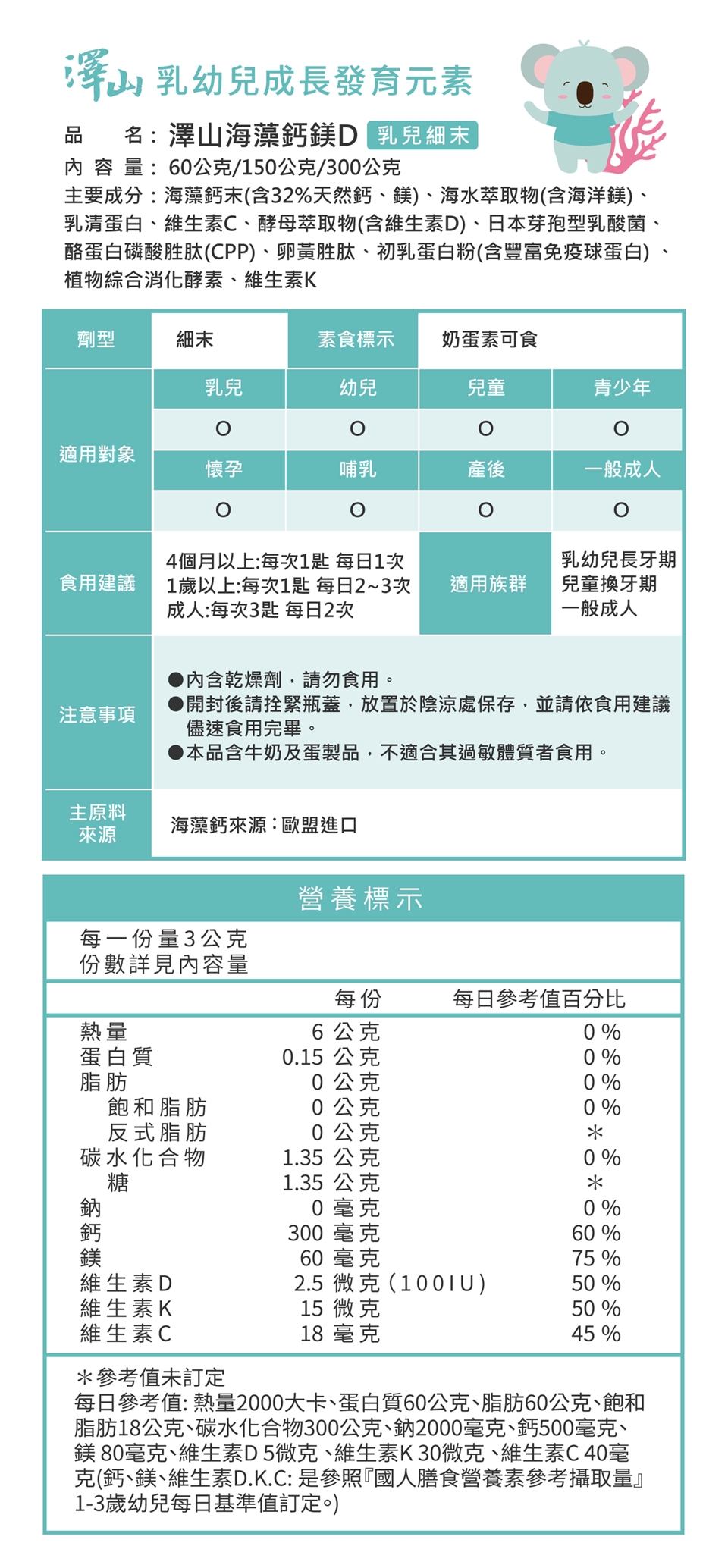 ◆澤山海藻鈣鎂D細末,使用歐盟純淨天然海藻鈣源,吸收度極佳。