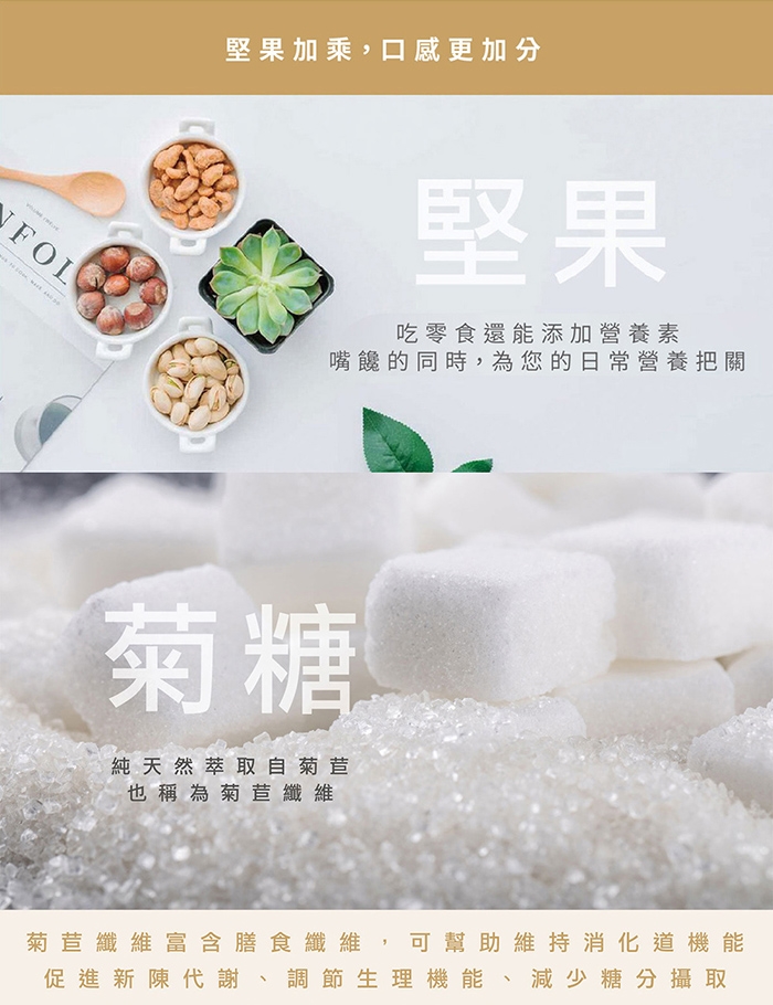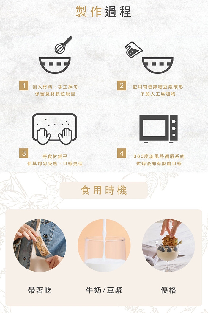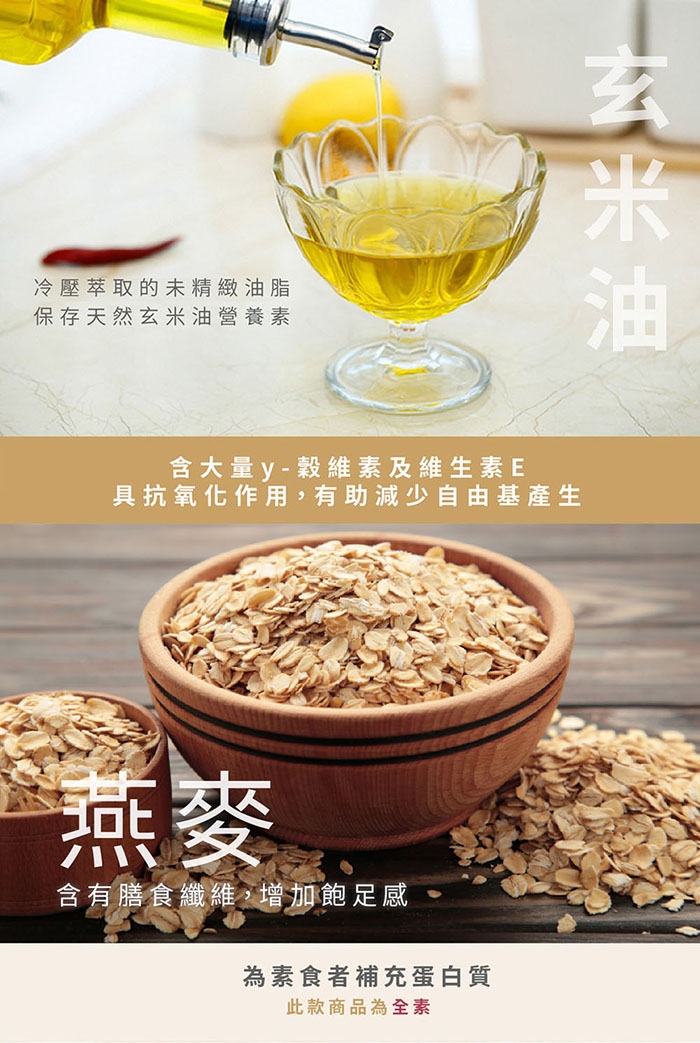 符合現代減糖少油需求,不計成本選用玄米油及菊糖,爽口不膩,富含纖維的燕麥及穀物,