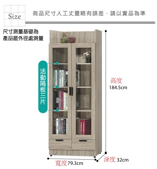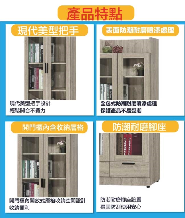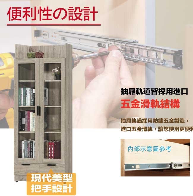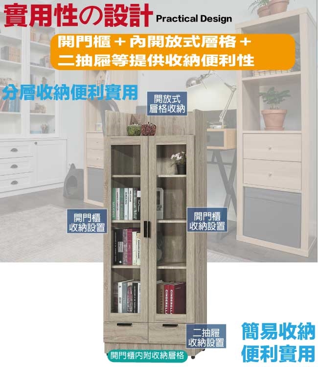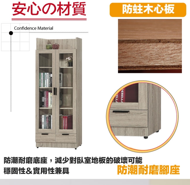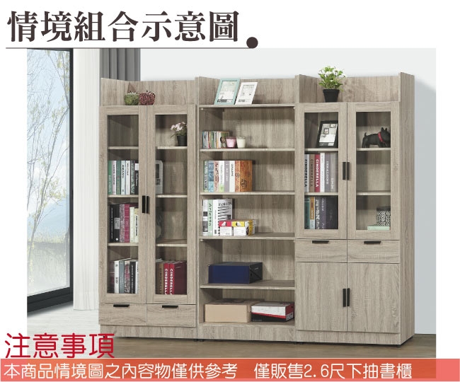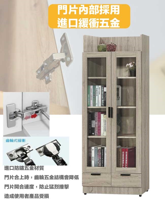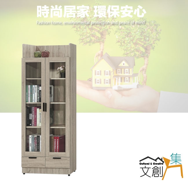 【文創集】泰雷2.6尺二門二抽高書櫃 橡木紋色系+現代簡約風格+安心材質製造,整體採用防蛀木心板+防潮耐磨腳座+五金滑軌結構+防夾手緩衝門片五金等安心材質製造,產品外層採用防潮耐磨噴漆處理搭配採用開門櫃+二抽屜+內開放式層格等收納空間設計,全由專人配送到家,專業安心服務,替你省下更多時間!