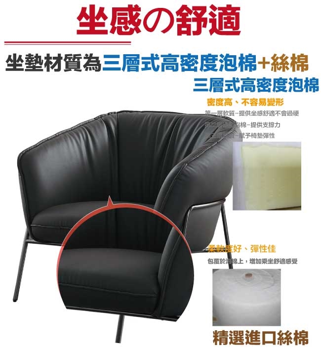 採用防鏽鋼管結構&不鏽鋼五金結構+防鏽五金腳座+三層式高密度泡棉+柔韌乳膠皮革等安心材質