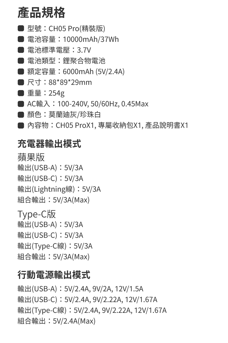 輸出(Type-C線): 5V/2.4A, 9V/2.22A, 12V/1.67A