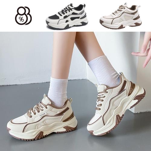 【88%】老爹鞋 運動鞋 休閒鞋 皮質/網布雙材質拼接雙色綁帶穿脫厚底5cm運動休閒鞋