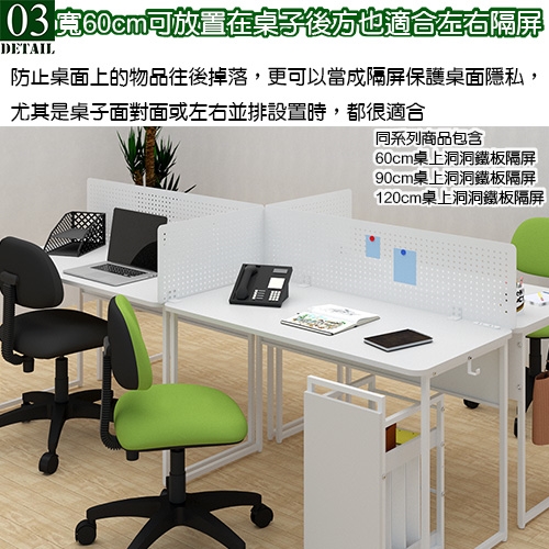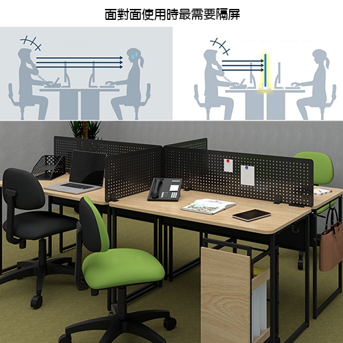 尤其是兩張桌子並排設置或是面對面設置時,更需要本商品來保護自我的隱私,營造私人小空間的氛圍,上班族也很適用。如果您的桌子使用位置不是靠牆邊使用的話,也需要《C&B》路蓋特桌上洞洞鐵板隔屏,除了防止放置於桌面上的書架、螢幕等物品掉落以外,更可以隨時隨地當成隔屏保護桌面隱私。